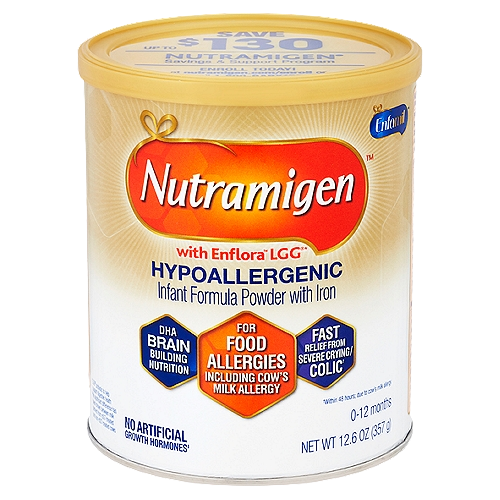 Enfamil Nutramigen is a specially formulated hypoallergenic infant formula designed to provide complete nutrition for infants with cow’s milk protein allergy or other severe food allergies. It is trusted by pediatricians and recommended for babies with a confirmed allergy to cow’s milk protein or those who exhibit colic-like symptoms due to cow’s milk sensitivity. Nutramigen is crafted to be gentle on your baby’s delicate digestive system, providing the essential nutrients they need to thrive during their crucial early stages of development.